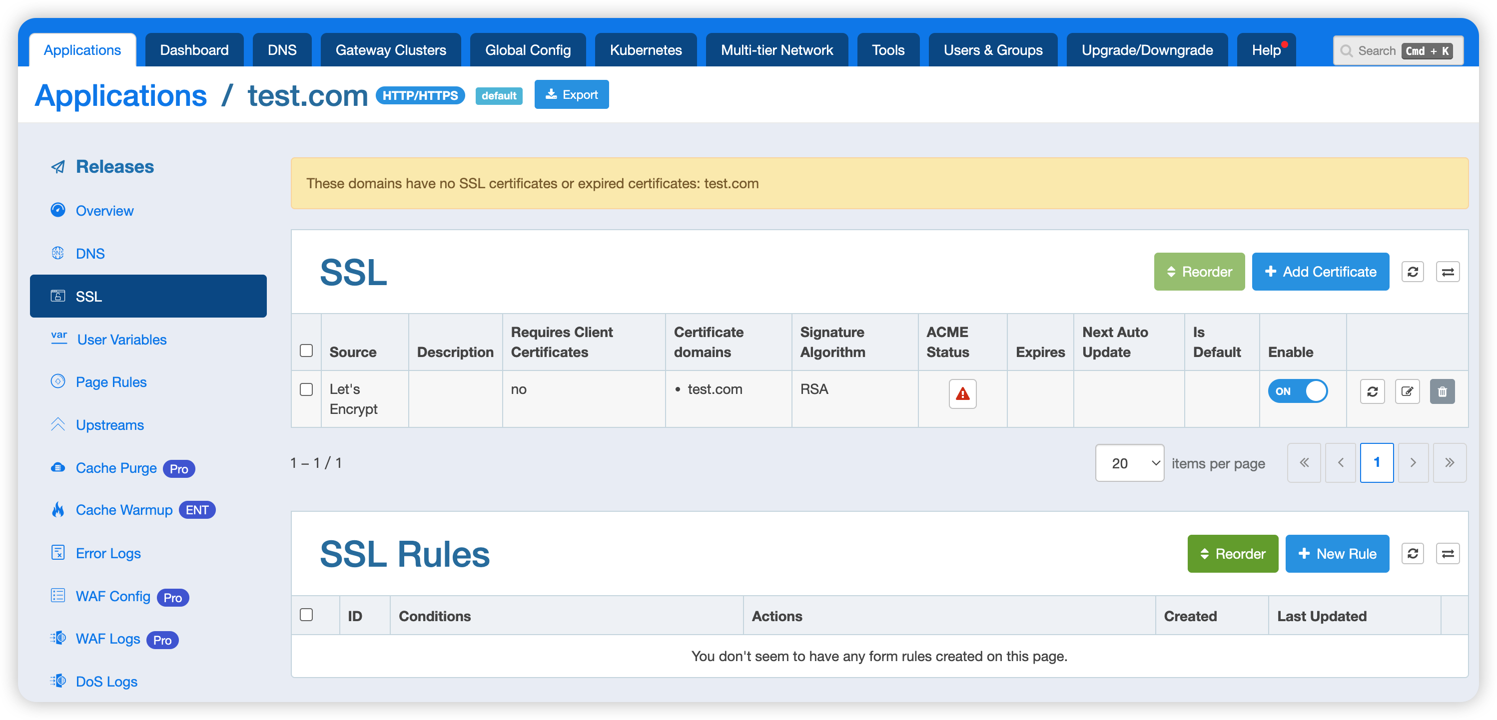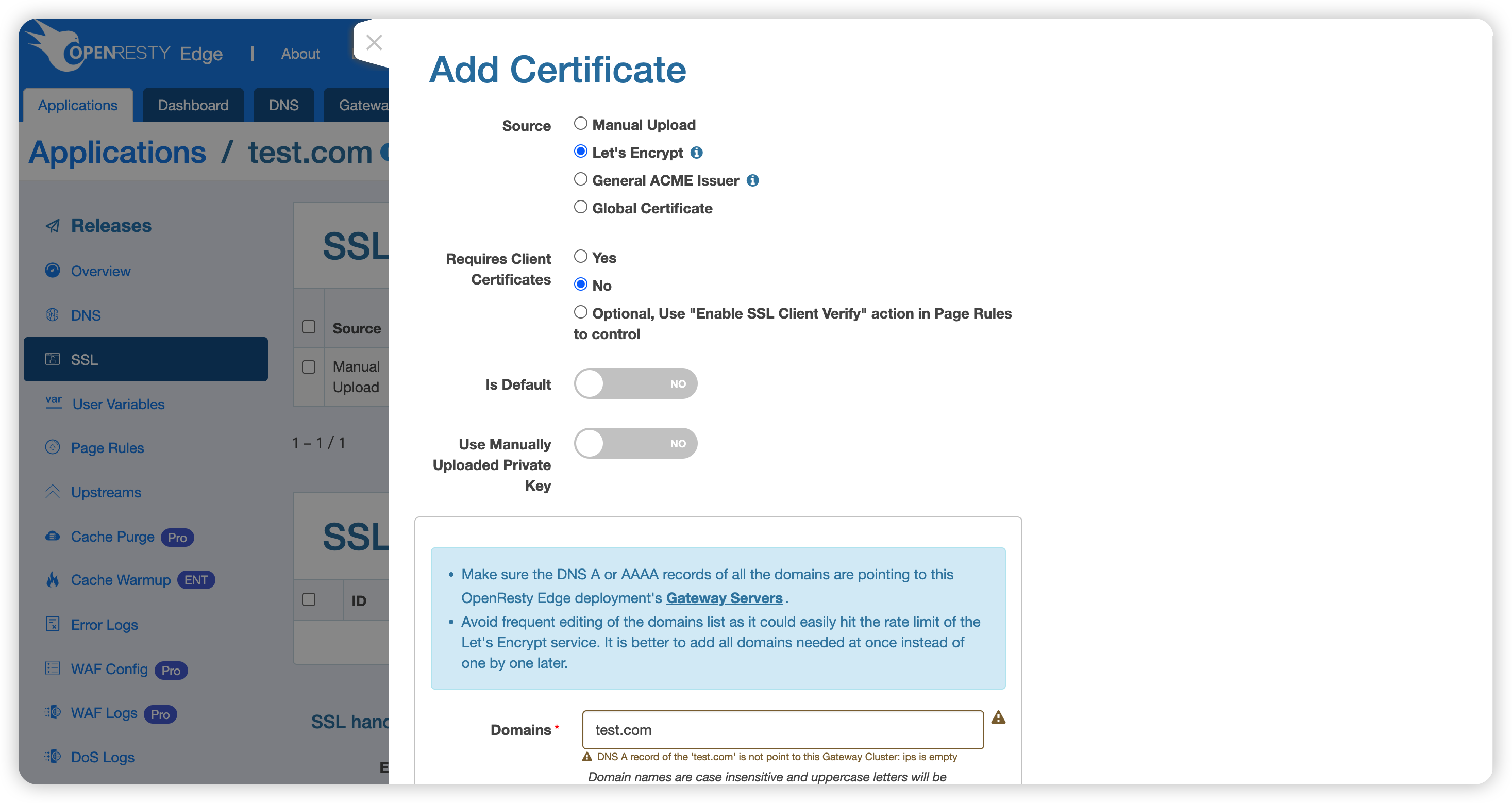 Let’s Encrypt 对非泛域名和泛域名使用不同的验证方式。OpenResty Edge 在签发时会自动检测每个域名应使用哪种方式,但需要你提前完成相应的配置。