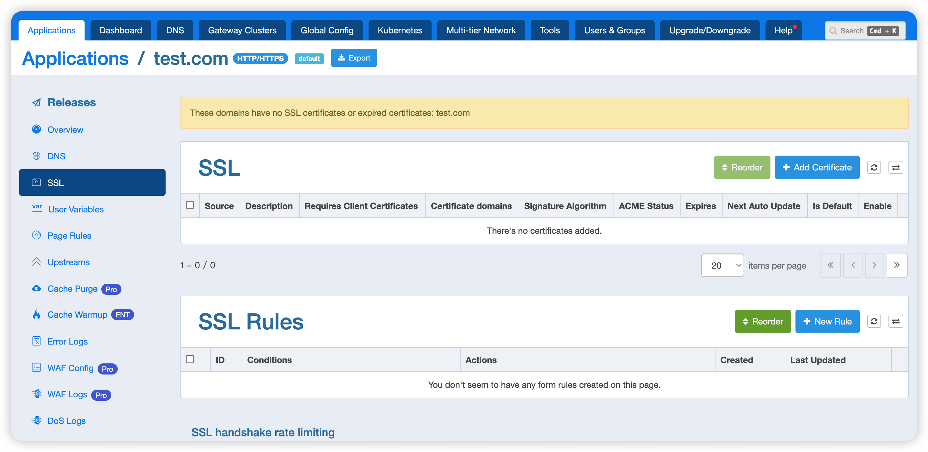 | “DNS NS record … is not point to this Gateway Cluster” | 域名的 NS 记录未指向 OpenResty Edge Node。请在域名注册商处修改 NS 记录。 |