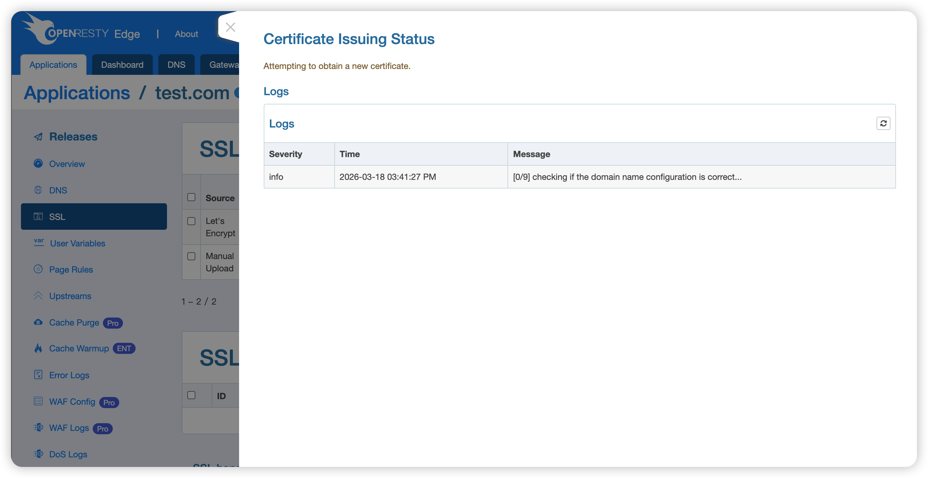 第三步:OpenResty Edge 会自动完成域名验证、证书申请和部署。刷新页面可查看签发状态。