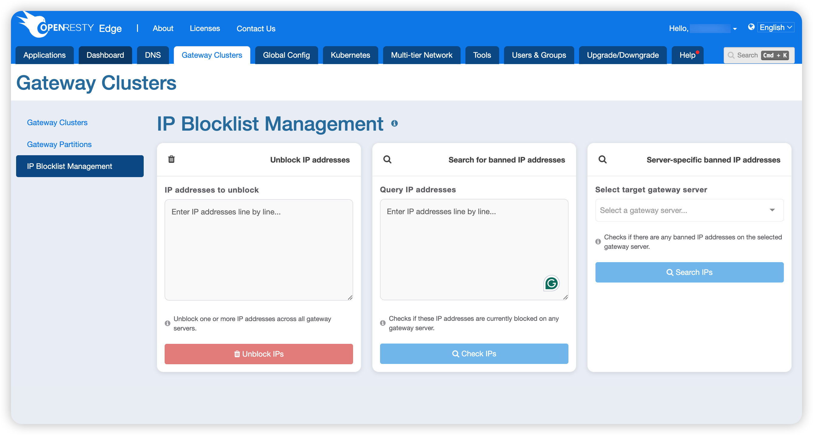 - Unblock IP Address: Unblock a specified IP across all OpenResty Edge Node gateway nodes